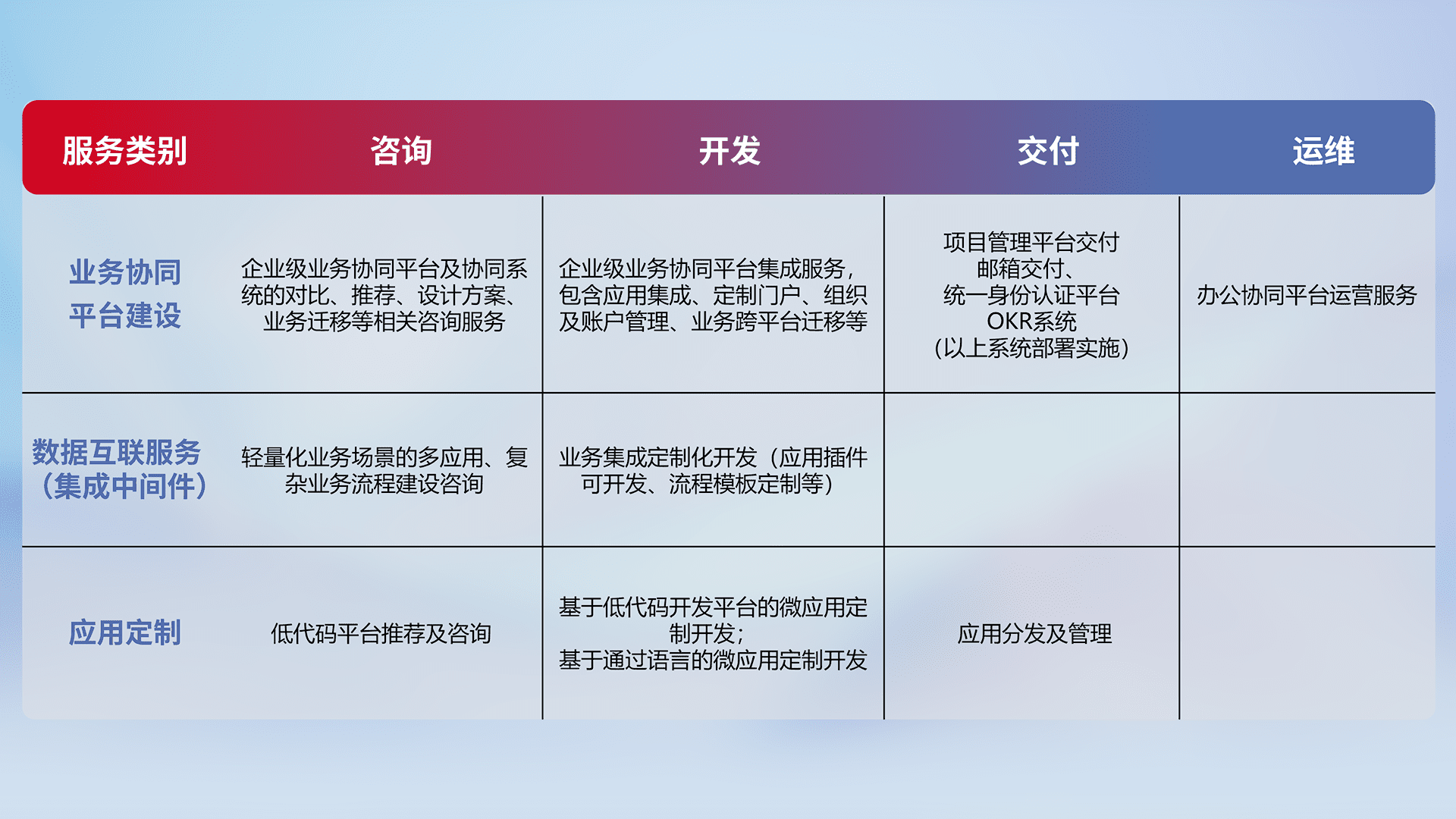 针对钉钉、、企微、、、IDaas等平台级产品提供产品的规划、、、、方案、、、交付、、定制化开发等服务,,,,实现如统一协同办公、、智能客户服务、、、、混合会议管理、、、智能数据查询、、、等业务场景,,实现数字化转型。。